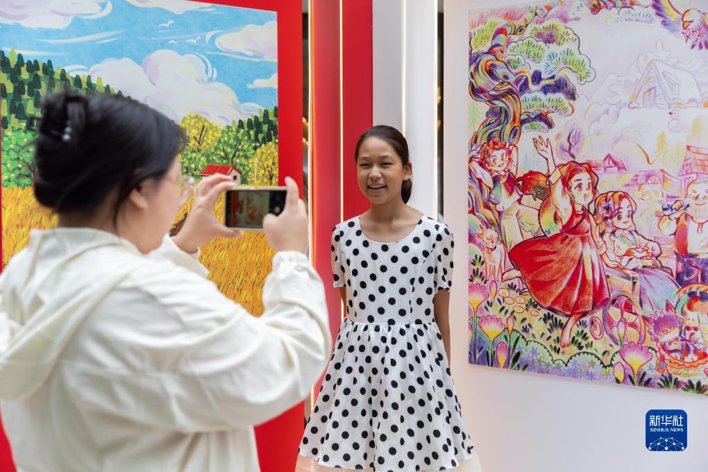 10月2日,人們在上海徐家匯書院廣場“一書一畫”藝術畫展上展出的繪畫作品前拍照。