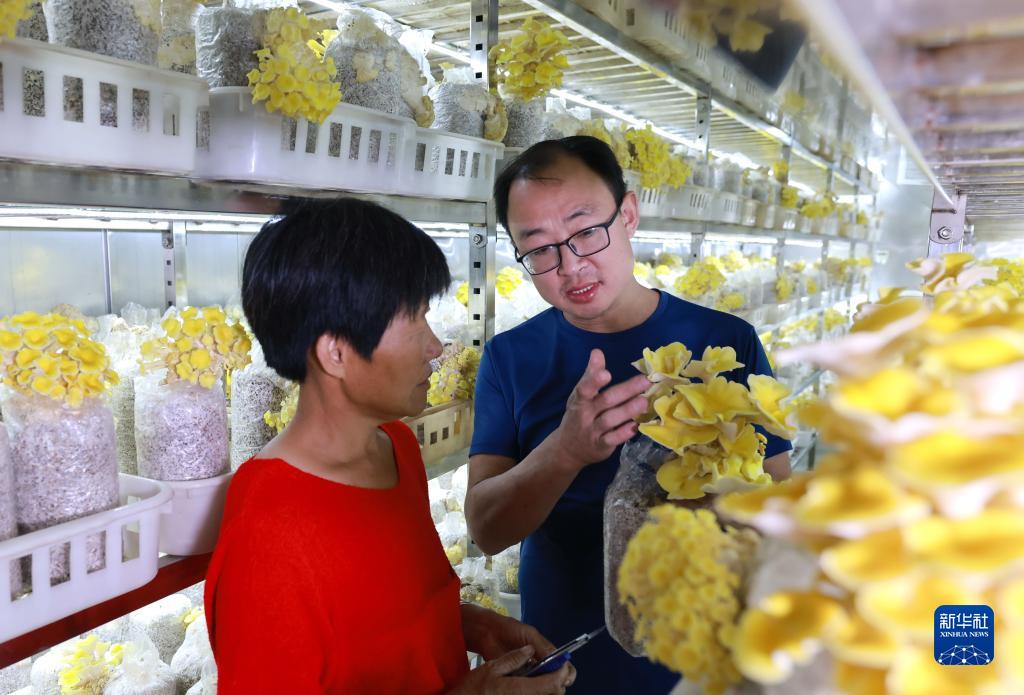 10月2日,河北省新河縣西流鄉南馬莊村一家榆黃蘑種植合作社的技術員(右)給社員講解榆黃蘑的管護知識。