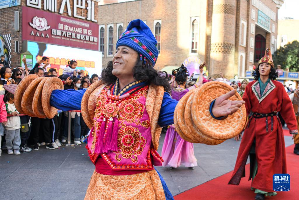 國慶假日期間,新疆烏魯木齊大巴扎步行街舉行的開街儀式吸引了不少游客,別具一格的民族音樂、舞蹈、雜技等,讓游客近距離感受絲路文化。