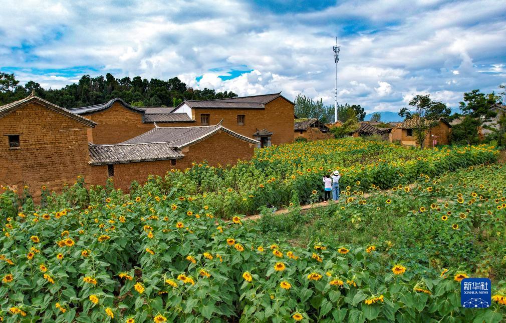 10月3日,游客在位于云南省昆明市滇池邊的臥龍古漁村內游覽拍照(無人機照片)。
