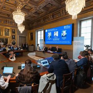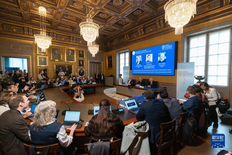 這是10月3日在瑞典斯德哥爾摩拍攝的2023年諾貝爾物理學(xué)獎(jiǎng)公布現(xiàn)場(chǎng)。