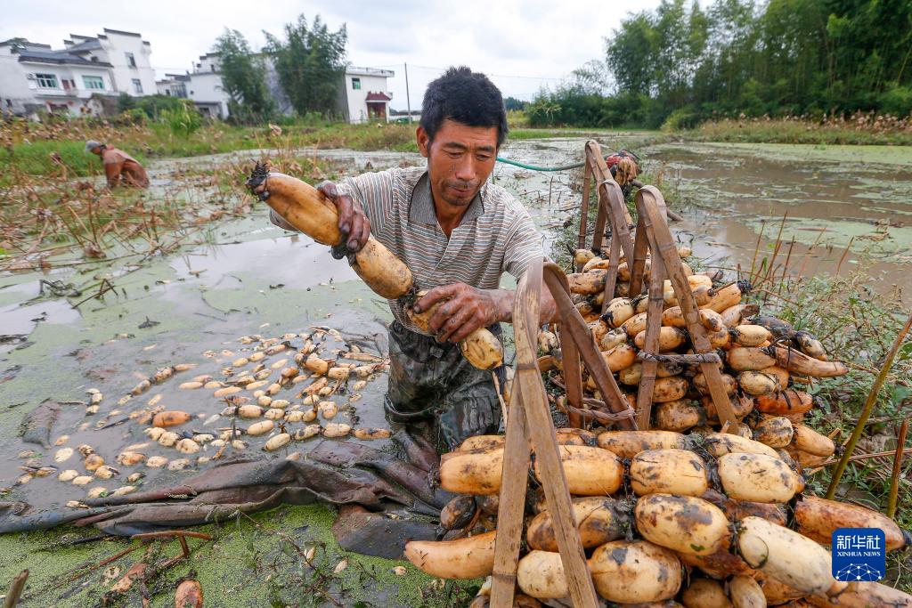 10月4日,村民在安徽省黃山市徽州區潛口鎮東山村采摘蓮藕。