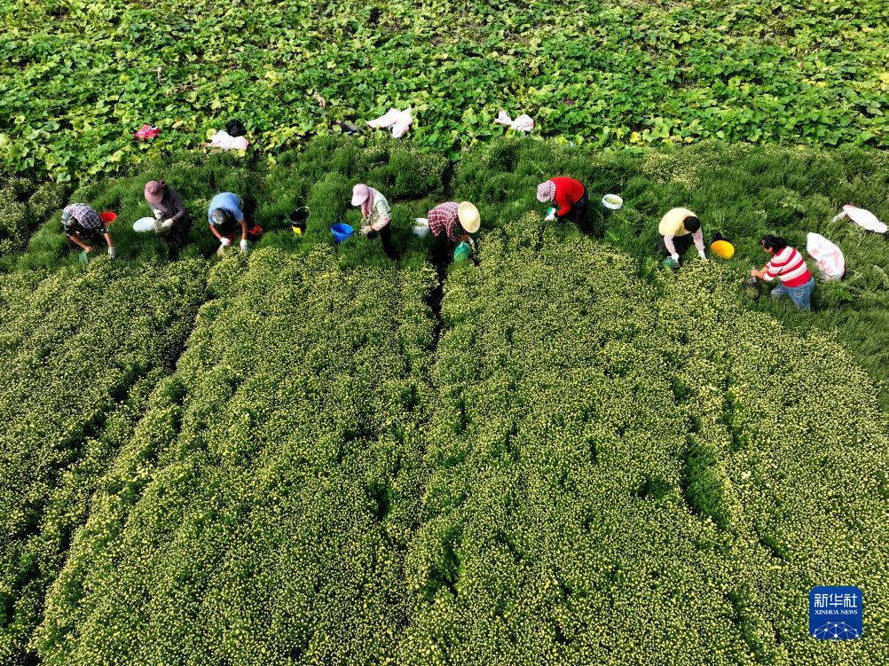 10月4日,在江蘇省鹽城市大豐區三龍鎮東紅村,村民采摘菊花(無人機照片)。