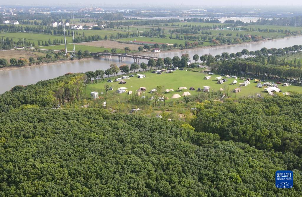 在上海松江區(qū)一處營地,市民游客在河邊草地上搭起帳篷(9月29日攝,無人機照片)。