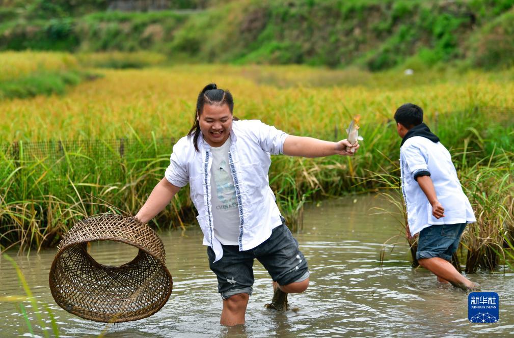 10月5日,貴州省黎平縣雙江鎮黃崗村的年輕人在秋收后的稻田里抓魚。