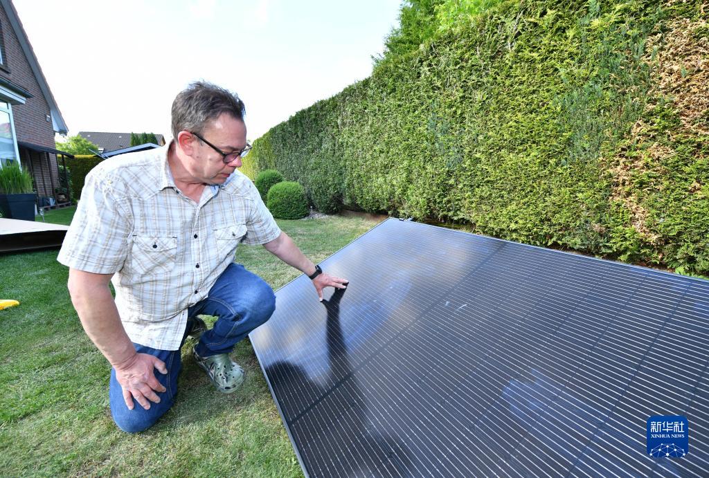 在德國施瓦岑貝克小鎮,當地居民迪爾克查看家中安裝好的中國產太陽能設備(5月30日攝)。