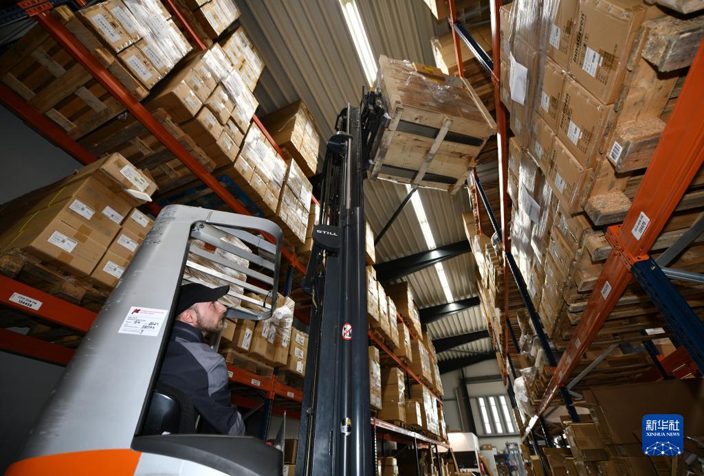 在位于德國阿倫斯堡的產(chǎn)品經(jīng)銷商勞克斯新能源有限公司,工作人員駕駛叉車搬運(yùn)中國產(chǎn)微型逆變器產(chǎn)品(5月30日攝)。