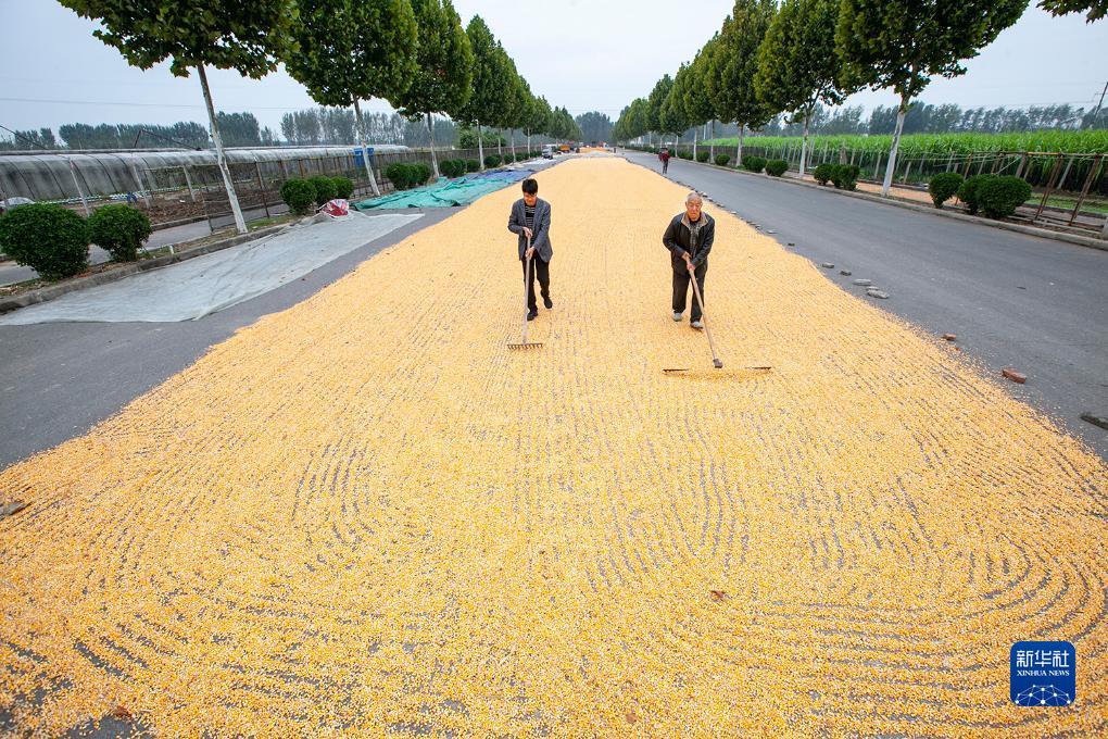 10月7日,在河南省焦作市博愛縣清化鎮(zhèn)街道太子莊村,村民晾曬剛收獲的玉米。