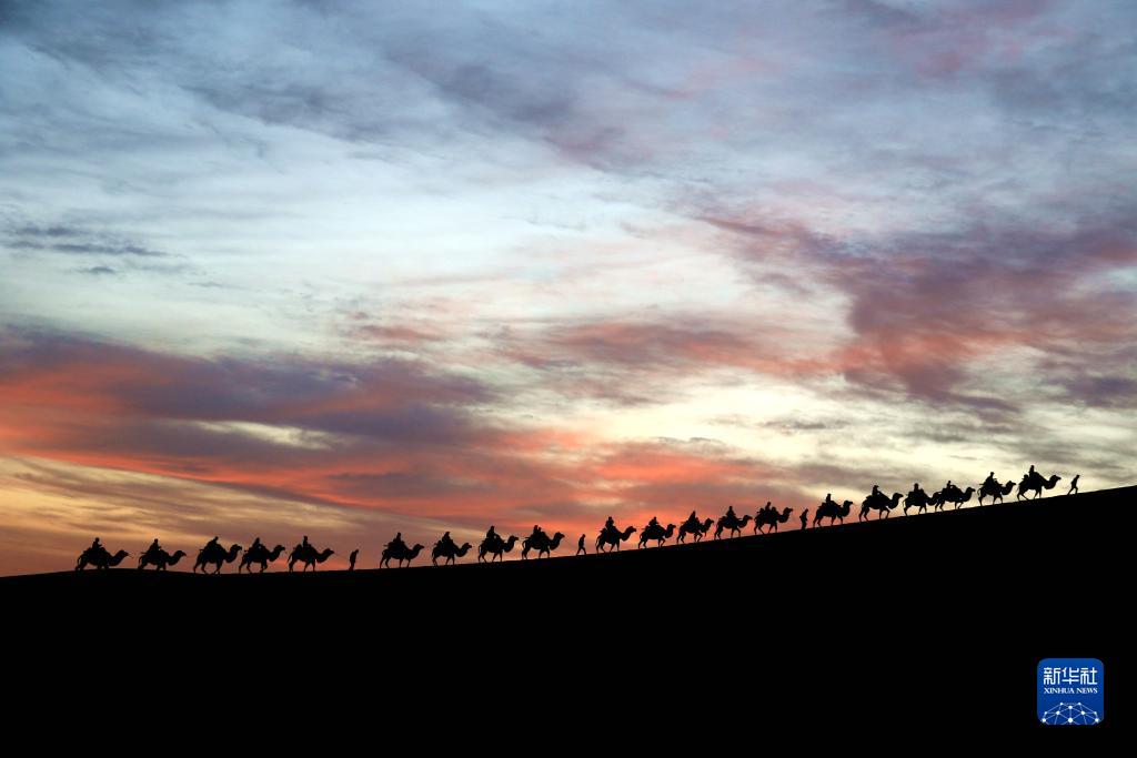 10月3日,游客在甘肅省敦煌市鳴沙山月牙泉景區(qū)乘駱駝?dòng)斡[。