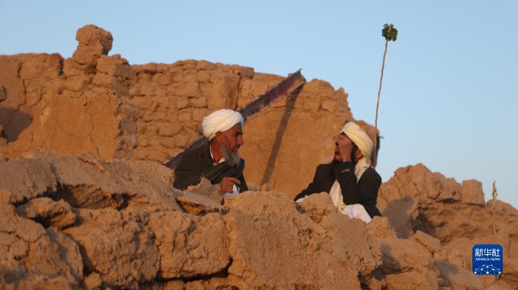 10月7日,兩名居民坐在阿富汗赫拉特省自家坍塌的房屋前。