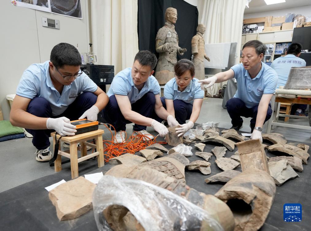 秦始皇帝陵博物院文物修復專家蘭德省(右一)在指導技術人員運用超聲波儀器測量秦俑胎體的密度(8月23日攝)。