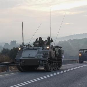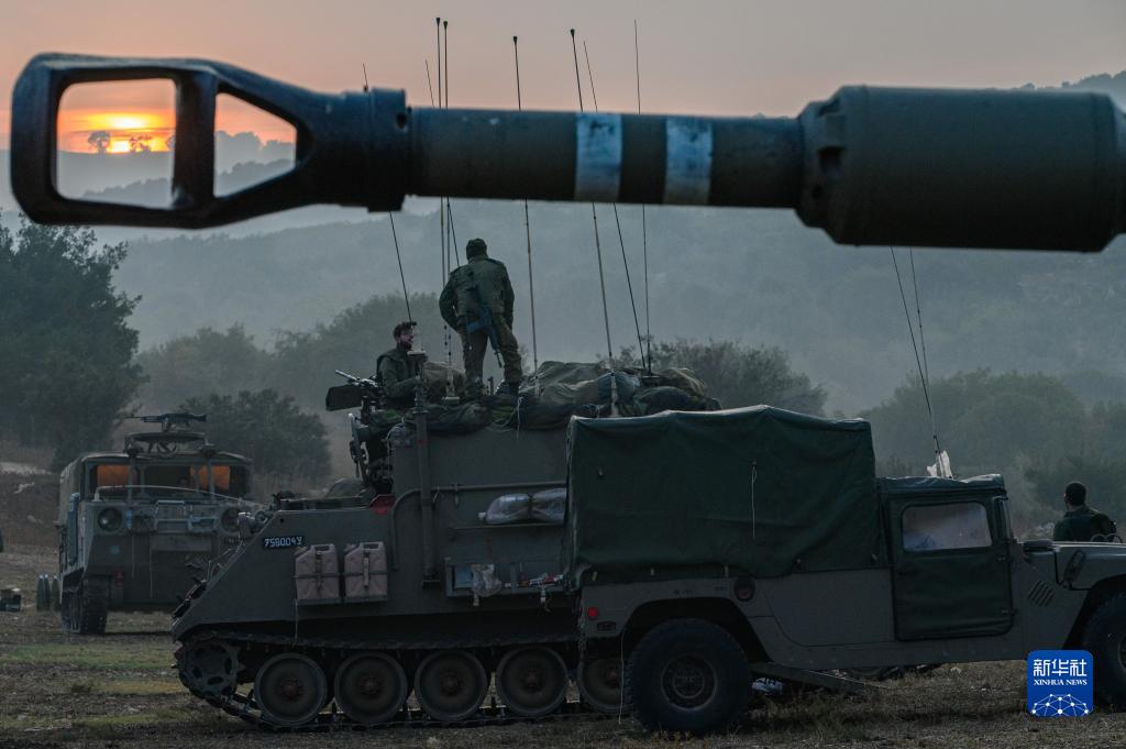 這是10月8日在以色列北部靠近黎巴嫩的邊境區域拍攝的以色列軍用車輛。