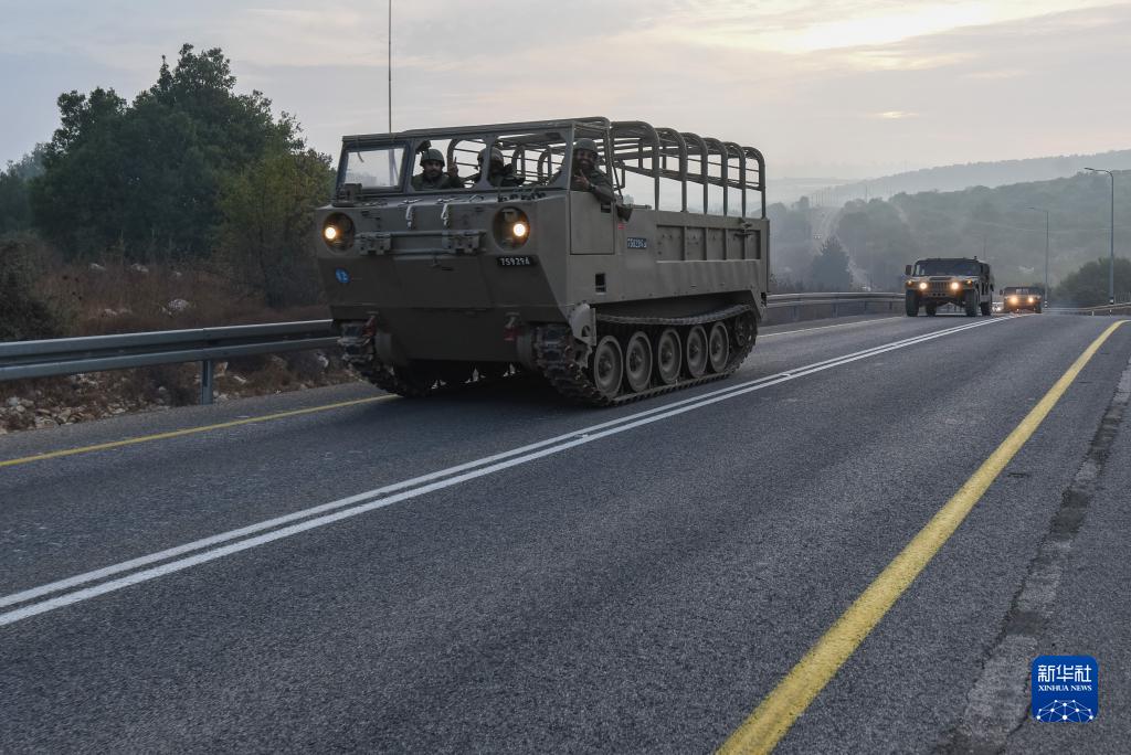 10月8日,以色列軍用車輛在北部靠近黎巴嫩邊境區域的道路上行駛。