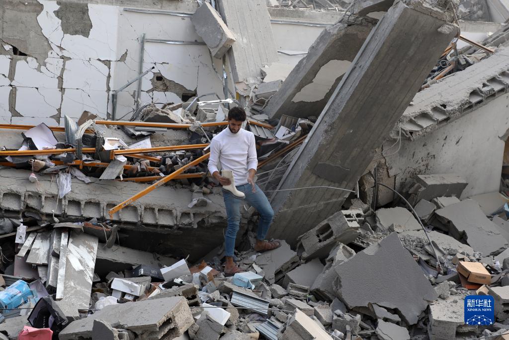 10月8日,在加沙城,巴勒斯坦人查看以色列空襲后的建筑廢墟。
