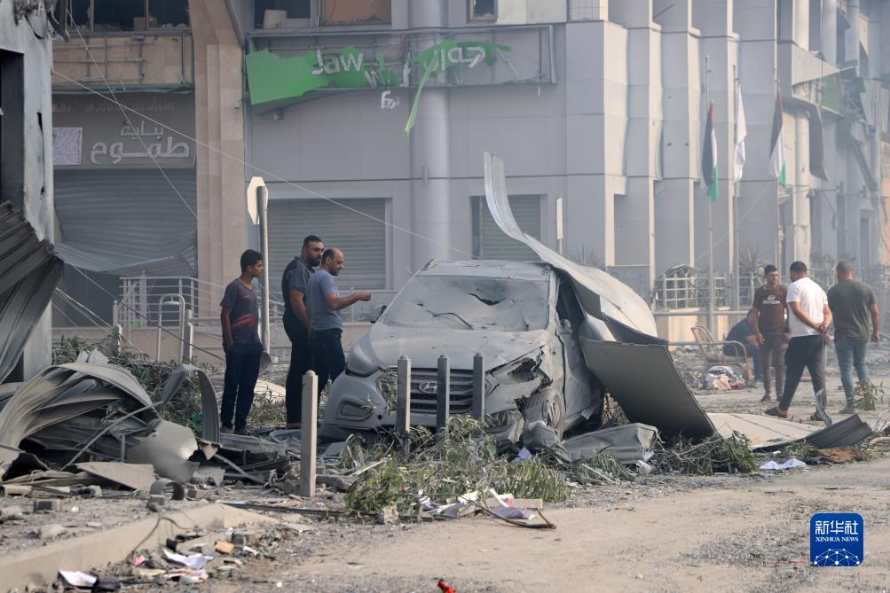10月8日,在加沙城,巴勒斯坦人查看被以色列空襲炸毀的汽車。