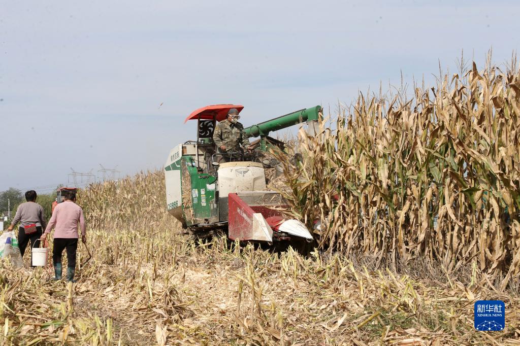 10月8日,農(nóng)民駕駛收割機在河南省駐馬店市驛城區(qū)水屯鎮(zhèn)水屯村搶收玉米。