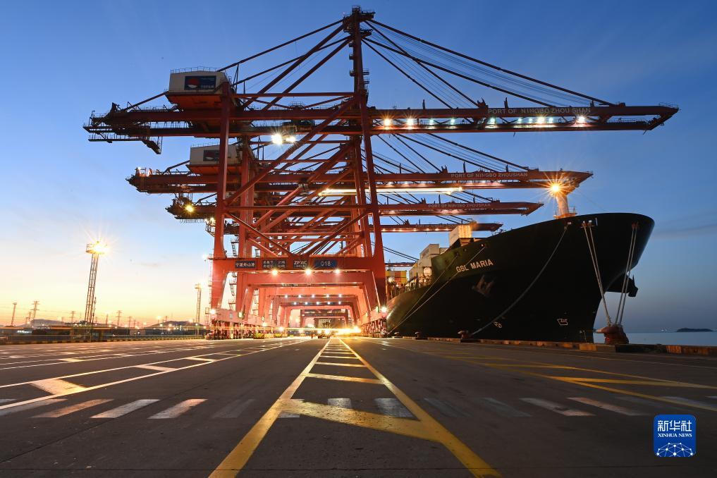 一艘貨輪停靠在寧波舟山港穿山港區集裝箱碼頭(2023年1月31日攝)。