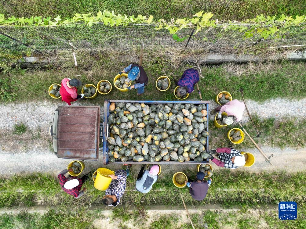 10月8日,在湖南省永州市道縣四馬橋鎮昌瑞瑤寨蔬菜種植基地,村民將南瓜裝車(無人機照片)。