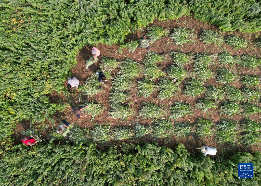 10月8日,農民在山東省臨沂市沂南縣銅井鎮杜山村艾草種植基地收割艾草(無人機照片)。