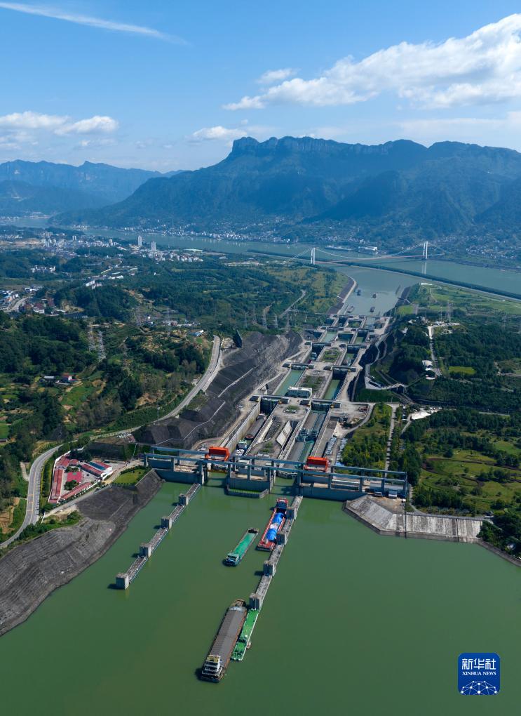 10月8日,在湖北省宜昌市,船舶有序通過三峽雙線五級船閘(無人機照片)。