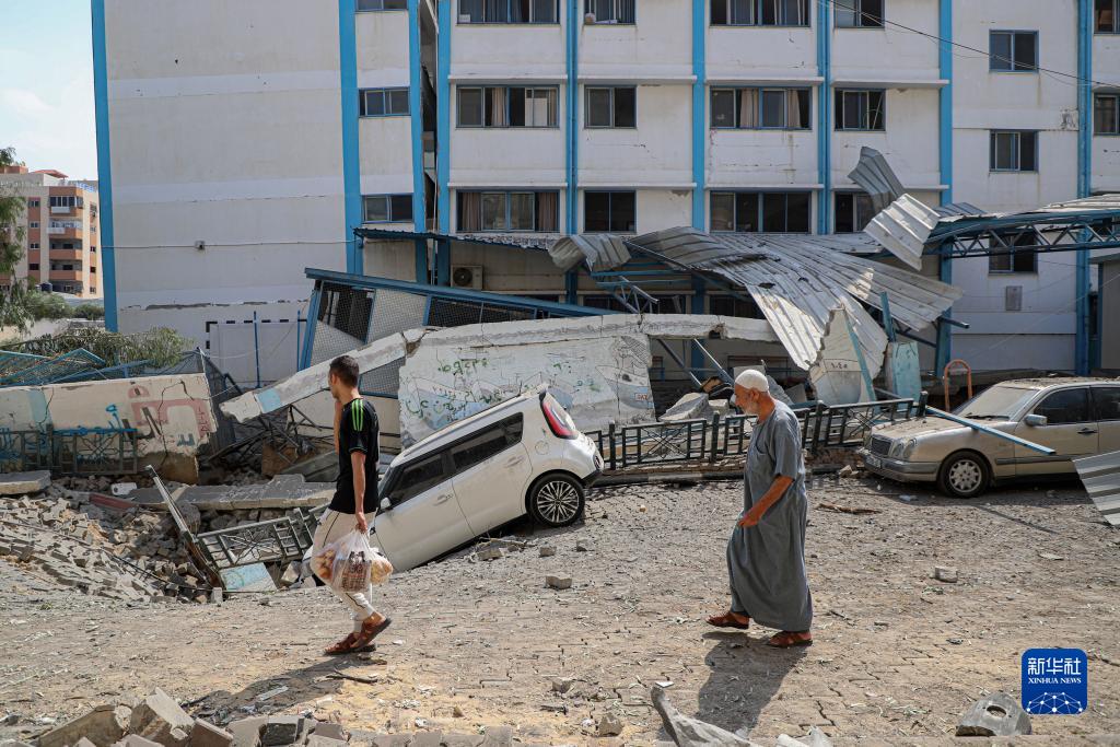 10月8日,在加沙城,人們走過被以色列空襲炸毀的一所學(xué)校的入口。