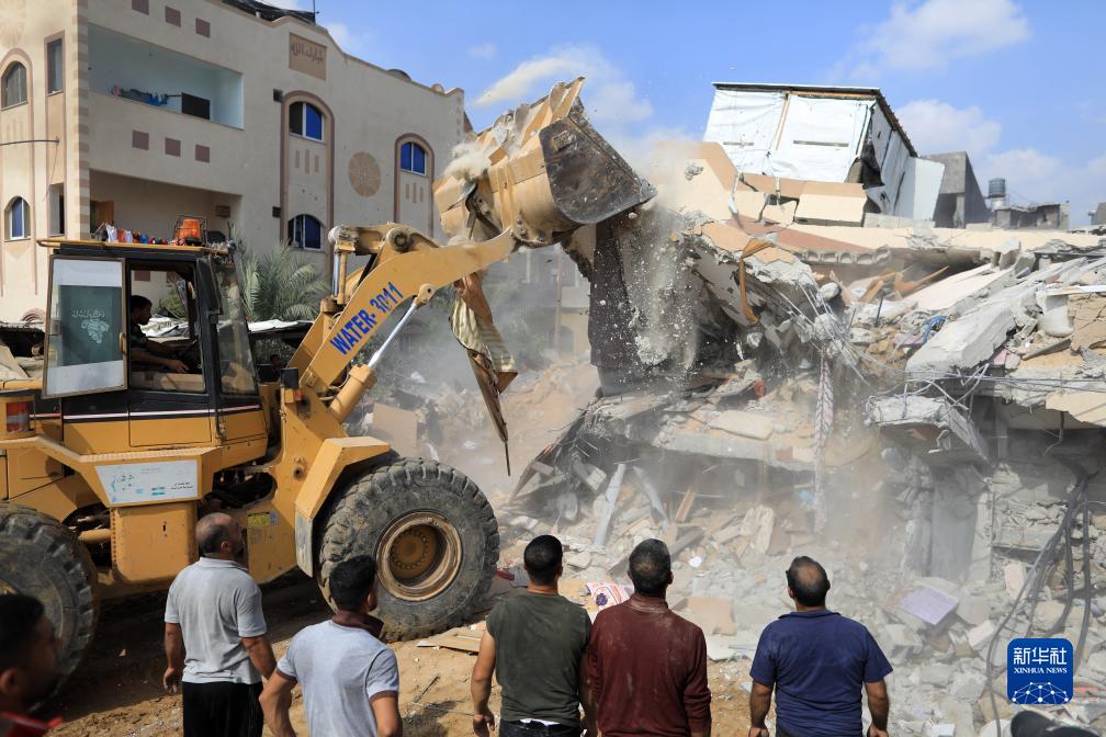 10月8日,在加沙地帶南部城市汗尤尼斯,人們在以色列空襲后的建筑廢墟中搜尋幸存者。