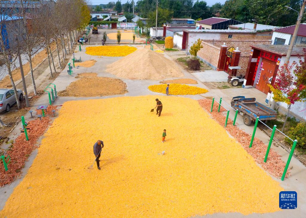 10月7日,在山東省聊城市茌平區賈寨鎮,農民在晾曬玉米(無人機照片)。
