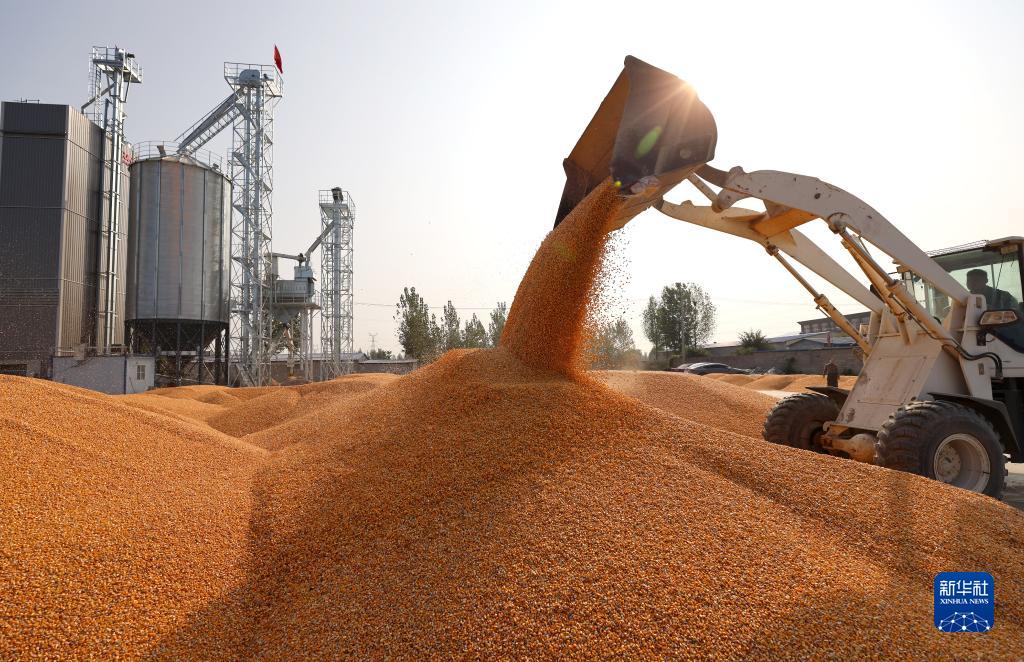 10月8日,在山東省棗莊市西王莊鎮(zhèn),農機手操作機械傳運利用烘干設備烘干的玉米。