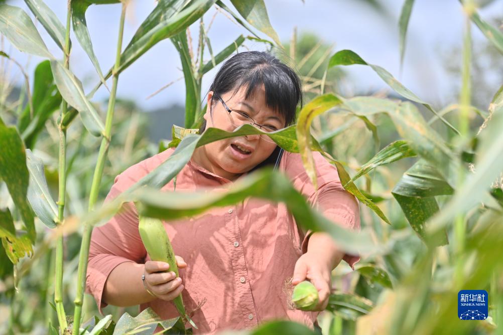 楊寧在田間一邊收玉米,一邊接聽工作電話(10月8日攝)。新華社記者 黃孝邦 攝