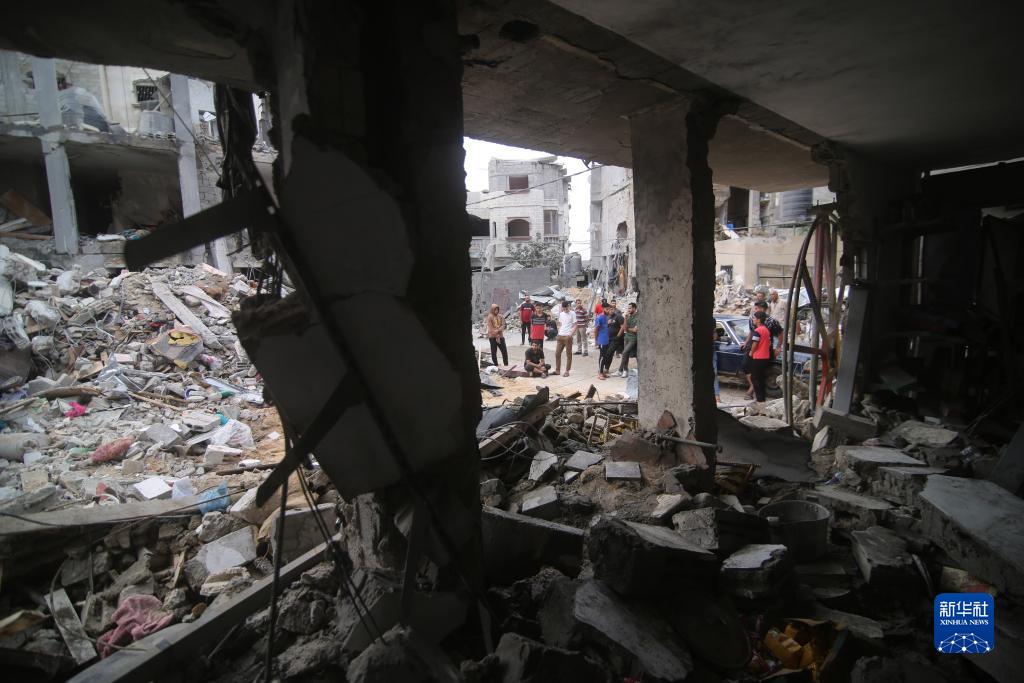 10月9日,在加沙地帶南部城市拉法,人們聚集在被以色列空襲炸毀的建筑旁。