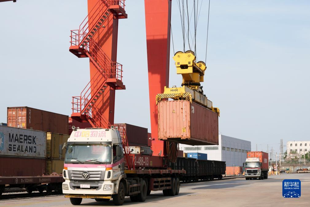 5月9日,在位于江蘇連云港的中哈連云港物流合作基地,大型機(jī)械在裝載貨物。