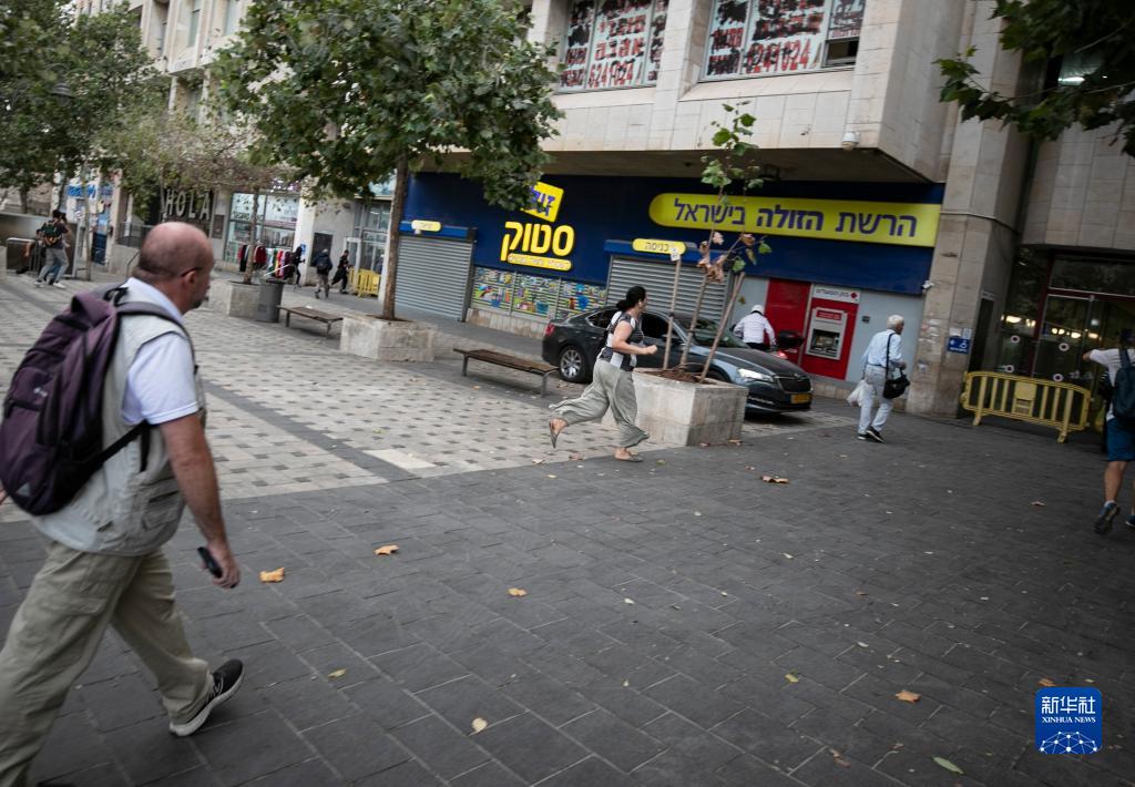 10月9日,在耶路撒冷街頭,人們在防空警報響起時沖向避難設施。