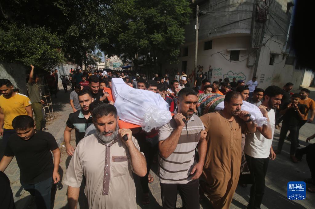 10月9日,在加沙地帶南部城市拉法,人們抬著以色列空襲遇難者遺體。