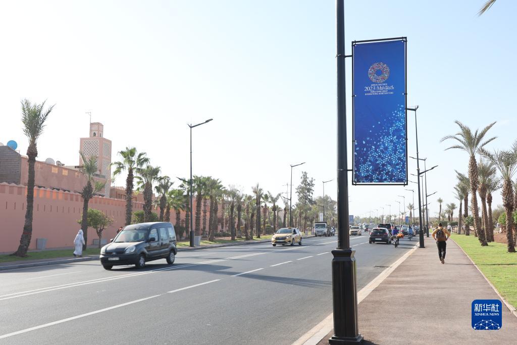 這是10月9日在摩洛哥馬拉喀什舉行的國際貨幣基金組織(IMF)和世界銀行2023年年會現場附近拍攝的年會宣傳海報。