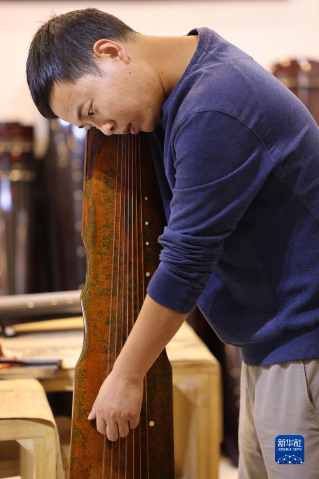 10月9日,河南省蘭考縣堌陽鎮(zhèn)徐場村的斫琴師徐亞沖為古琴調(diào)音。