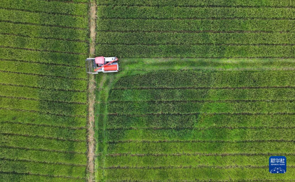 10月10日,農(nóng)機(jī)手駕駛收割機(jī)在湖南省靖州苗族侗族自治縣甘棠鎮(zhèn)溪口村收割制種水稻(無(wú)人機(jī)照片)。