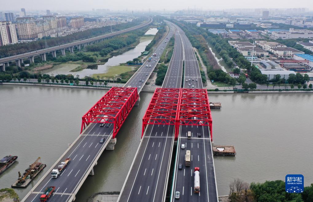 10月10日,車輛通過滬寧高速公路青陽港大橋(無人機照片)。