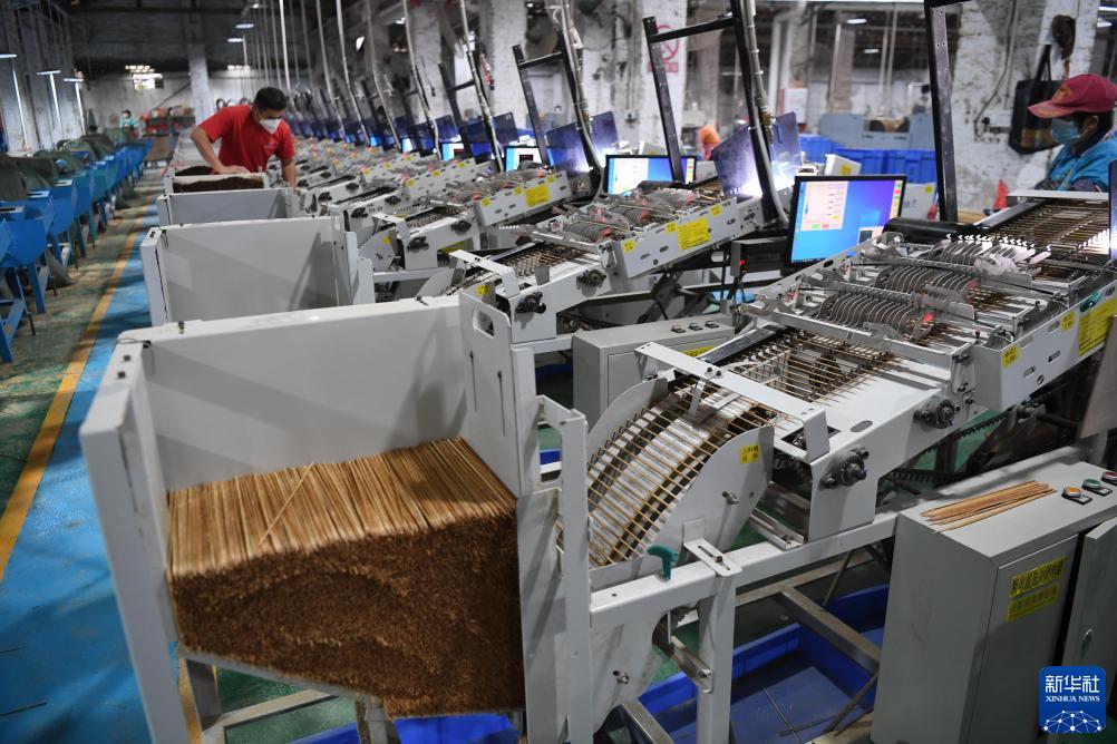 10月9日,在廣東廣寧縣一家竹制品廠,工作人員維護竹簽自動化生產設備。