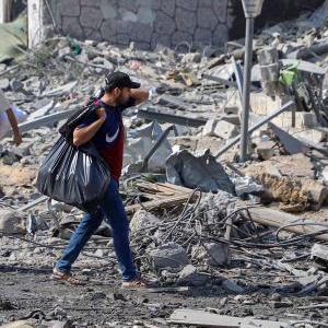這是10月10日在加沙城拍攝的被以色列空襲炸毀的建筑廢墟。