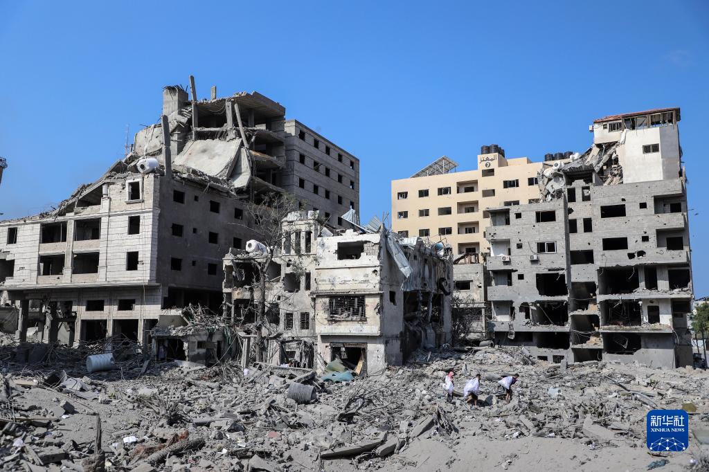 這是10月10日在加沙城拍攝的被以色列空襲炸毀的建筑廢墟。