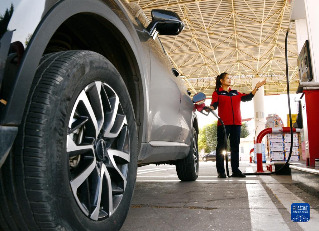 10月10日,河北省石家莊市欒城區(qū)一加油站的工作人員給車輛加油。
