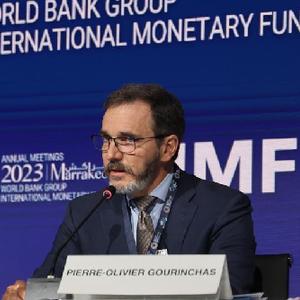 10月10日,在摩洛哥馬拉喀什,國際貨幣基金組織首席經濟學家皮埃爾-奧利維耶·古蘭沙在《世界經濟展望報告》發布會上講話。