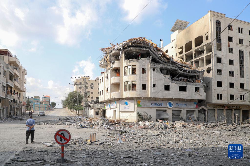 10月10日,在加沙城,人們走過被以色列空襲炸毀的建筑廢墟。