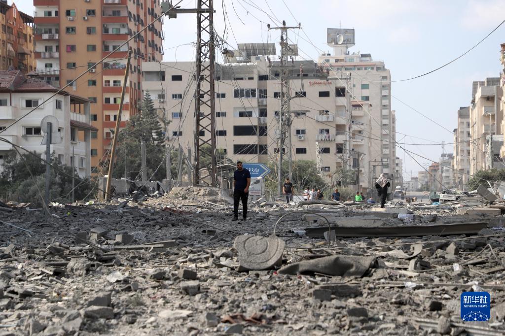 10月10日,在加沙城,人們走過被以色列空襲炸毀的建筑廢墟。