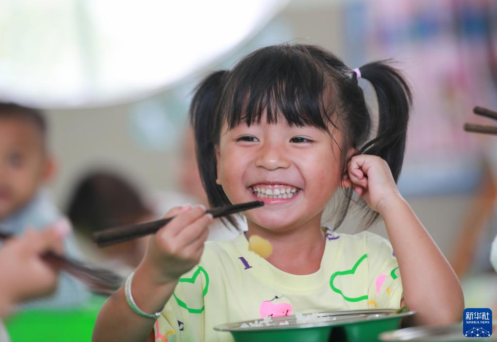 貴州省從江縣剛邊壯族鄉(xiāng)中心幼兒園的小朋友在享用免費(fèi)營(yíng)養(yǎng)午餐(2023年9月15日攝)。近年來(lái),多地持續(xù)推進(jìn)農(nóng)村學(xué)生營(yíng)養(yǎng)午餐關(guān)愛(ài)工程、免費(fèi)午餐等項(xiàng)目,針對(duì)當(dāng)?shù)貙W(xué)生的膳食習(xí)慣,科學(xué)合理搭配菜品、果品,切實(shí)提高膳食結(jié)構(gòu)和質(zhì)量,確保學(xué)生吃得飽、吃得好,保障學(xué)生健康快樂(lè)。