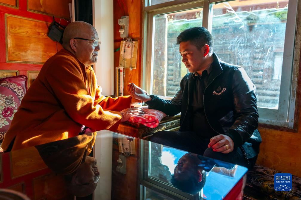 10月10日,在四川甘孜藏族自治州理塘縣,囊索·嘉培藏醫(yī)世家第八代傳承人尖安益西(左)為當?shù)厝罕娫\療。