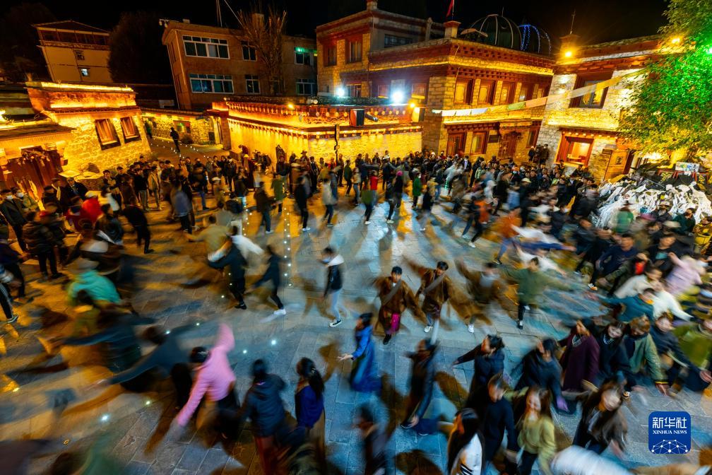 10月10日,人們在四川甘孜藏族自治州理塘縣勒通古鎮跳鍋莊舞。