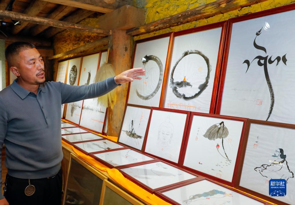 10月10日,在四川甘孜藏族自治州理塘縣,藏族書法家昂旺曲批展示其將藏文書法與傳統水墨畫相結合創作的作品。