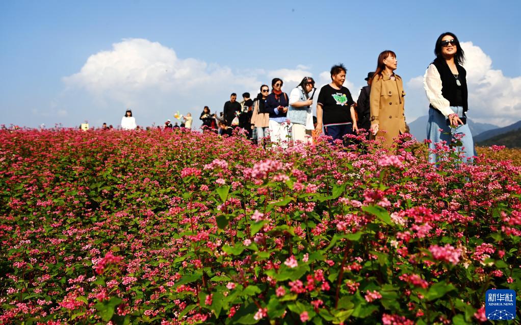 10月10日,游人在陜西省西安市藍(lán)田縣九間房鎮(zhèn)峪口村蕎麥嶺賞花游玩。