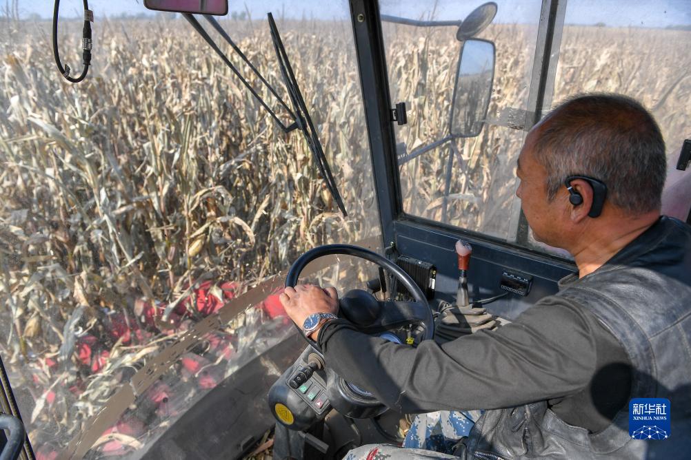 10月11日,在吉林省公主嶺市范家屯鎮乾程農民專業合作社,農民操作農機收獲玉米。